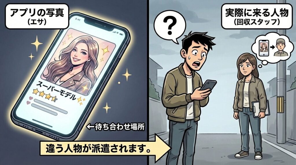 これは、プロフィール写真には「絶世の美女(AI画像や盗用画像)」を使い、実際の待ち合わせ場所には 「全く別の女性(スタッフ)」 を送り込む手口です。