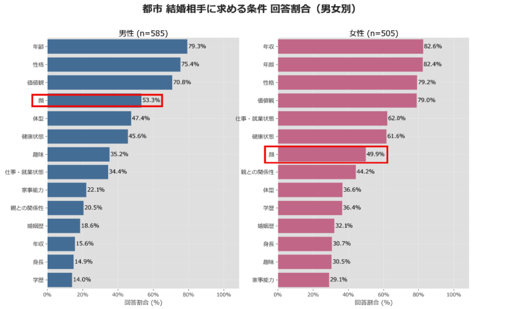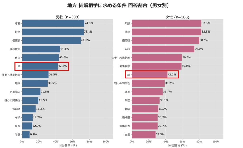 結婚相手に求める条件で「顔」と回答したのは「都市の男性」が約53%とほぼ半数程度、「都市の女性」「地方の男性」「地方の女性」に関しては、50%以下となっています。