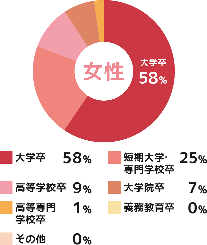 学歴は大卒以上が65%となっており、レベルが高いと言えるでしょう。